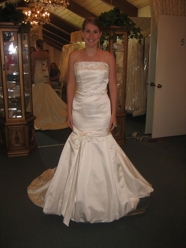 So anyways, when I made the appointment the lady on the phone was so nice and friendly and asked a ton of questions. When we arrived, she had already pulled a few dresses that she thought I might like and then I went through and picked a few more. While I was trying them on, Pat, the assistant kept asking questions to get a better feel for my personality and what kind of wedding I wanted to have. I felt like for the first time I had a sales lady who was using her expertise to help me. She actually told me what worked with my body and what didn’t, and I wasn’t offended to hear it since I knew she just wanted to help me.